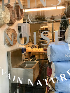 As I walked home from the right bank this afternoon, I passed another good bakery close to our apartment. In the back you could see where bread was being made. Loaves of raisin bread were out rising. Lined up in the window were these large sacks of many types of flours. The French sure know how to make the best bread and pastries.
